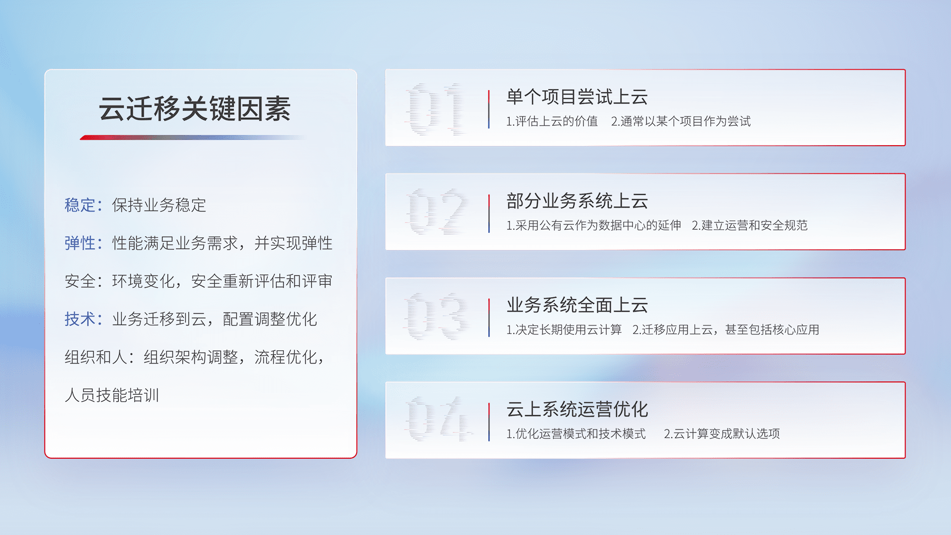 结合实际业务,,,,从规划设计、、、云平台选型、、、、云原生改造、、、数据迁移、、、、集成交付,,,,迁移全过程为客户识别最佳上云路径,,,做好风险识别管理,,,,设计网络架构、、、、身份权限、、安全审计合规、、、操作审计、、、、日志审计、、监控告警策略、、、、多站点容灾设计等,,对云上基础设施进行整体规划,,提升IT治理水平,,,以满足弹性、、、高可用、、、、高性能的需求。。