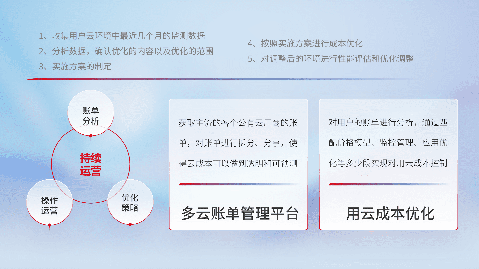 通过多云纳管,,,以统一的资源数据模型把客户的云资源进行抽象和封装,,进而实现对多云资源的统一操作,,,保障云资源管理的可靠性、、、、稳定性与可用性。。量身定制化运维内容,,,,配置、、开发运维、、、、补丁管理、、、备份、、监控、、认证和访问管理、、审计和日常巡检等,,,保障在用云过程中的可靠度,,,稳定度以及高可用率。。。。